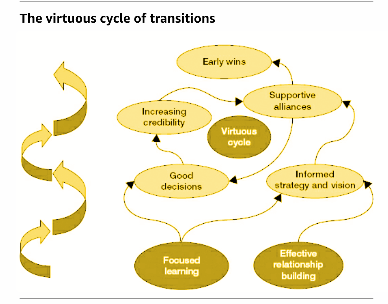 I believe wholeheartedly in the idea of the virtuous cycle as put forth by Michael Watkins in his book, “The First 90 Days: Critical Success Strategies for New Leaders at All Levels”. My overriding goal in the first 90 days is to get up to speed as quickly as possible. A virtuous cycle is a beneficial cycle of events or incidents, each having a positive effect on the next. My virtuous cycle begins with an introduction.